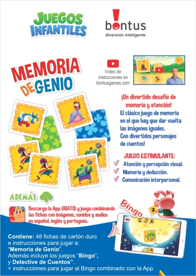 48 fichas de cartón duro e instrucciones Además incluye los juegos "Bingo" y "Detective de cuentos" + instrucciones para jugar al Bingo combinado con la app.